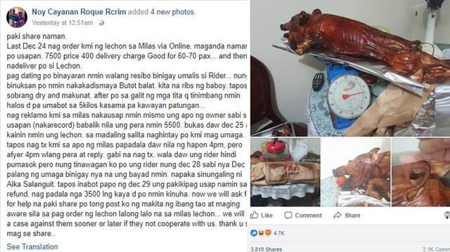 Bukan menu yang murah, mereka membeli lechon secara online seharga 7000 Peso Filipina (Rp1,8 juta), sebagaimana ditulis di unggahan Facebook-nya.
