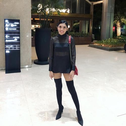5. Tampil serba hitam dengan high heels hitam andalan Millen.
