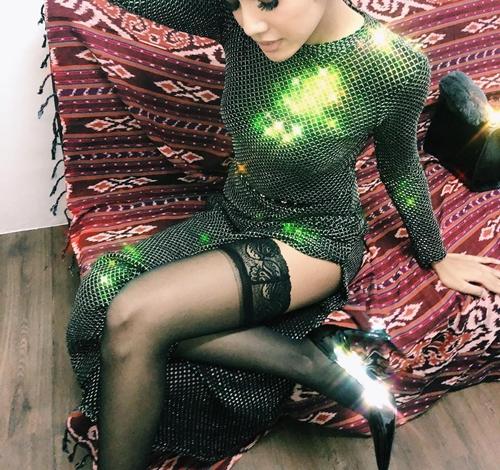 4. Tampil seksi dengan dress dengan belahan tinggi dan high heels hitam.