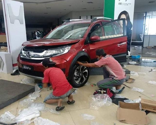 Oknum penjarah sedang melepas roda Honda Mobilio yang jadi display di Mall