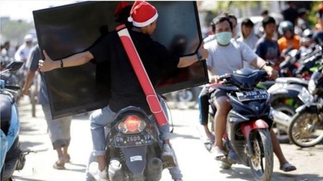Tsunami di Palu: Penjarahan di Palu dari Sembako Hingga LED Layar Lebar Itu Jadi Berita Media Asing, tampak pengendara sepeda motor membawa LED Artikel ini telah tayang di sripoku.com dengan judul Foto-Foto Penjarahan Pasca Tsunami di Palu, Mulai Toko, Mall Hingga ATM pun Jadi Sasaran,